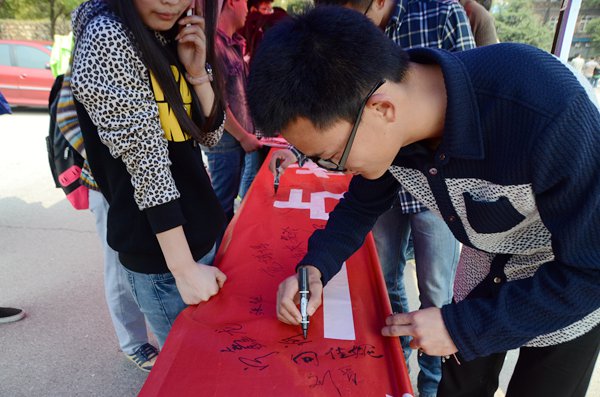 3月18日,365官网于美食广场前开展了戒烟签名活动,活动由校风督察部与青年志愿团联合承办。一幅巨大的戒烟标语刚铺在摆点处,就吸引了众多同学自发前来签名,其中不乏很多女生。一位女生和她的男友在横幅上签下了俩人的名字,她说,她多次劝告男友戒烟都没有效果,这次赶上学院戒烟活动她是铁了心要让男友成功戒烟。当天,共有800余名同学在戒烟横幅上签名。